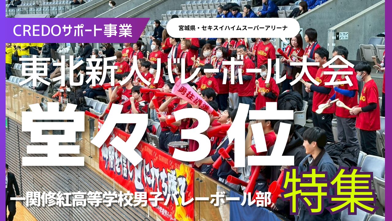 2026年2月14日こんにちは、プライベートジムCREDOです。令和8年2月9日(月)から11日(水)の3日間、宮城県・セキスイハイムスーパーアリーナにて開催された令和7年度第15回東北高等学校新人バレーボール選手権大会。CREDOがサポートする一関修紅高校男子バレーボール部が、岩手県代表として東北6県の強豪が集う大舞台で、見事第3位の成績を収めました!